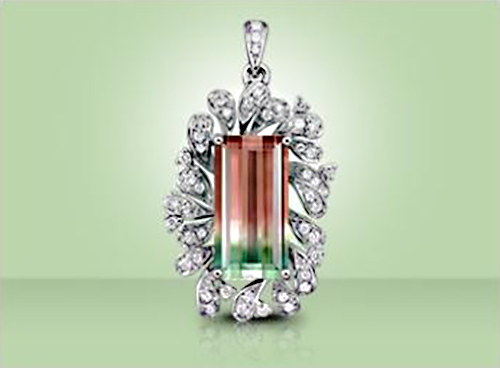 颜色: 西瓜碧玺具有绿色和红色两种颜色。一种情况是绿色在外围,红色在中心,就像西瓜,因而称为“西瓜碧玺”。还有一种是一半绿色一半红色的西瓜碧玺